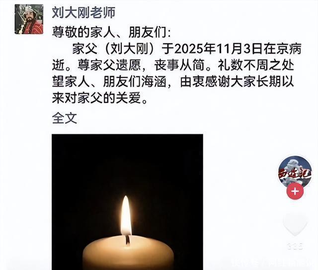 7日晚间,刘大刚老师的儿子发布讣告,称他父亲4天前在北京因病去世。 从讣告内容上看,应该是刘大刚的儿子料理后事之后,向亲朋好友告罪,希望大家能担待礼数不周之处,因为老爷子遗愿就是一切从简。